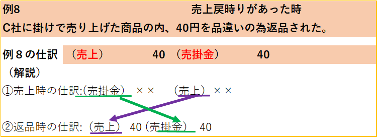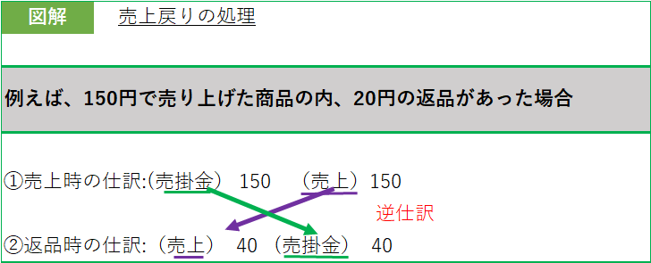 - 売り上げた商品が返品された時 売り上げ戻りがあった時はいったん計上した売上【収益】を取り消します。なお、代金は通常、売掛金【資産】と相殺します。つまり、売上戻りがあった時は、返品された分だけ売り上げた時の仕訳の逆仕訳(売り上げた時の仕訳の借方科目と貸方科目を反対にした仕訳)をするのです。