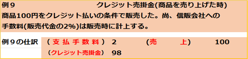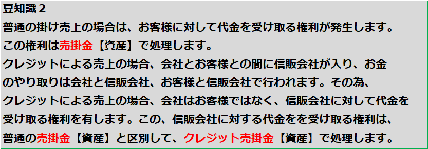 - 商品を売り上げた時 商品を売り上げ、代金の支払いがクレジットカードで行われた時は、(クレジットによる)後で代金を受け取る権利をクレジット売掛金【資産】で処理します。尚、代金の支払いがクレジットカードで行われる場合、会社は信販会社に決済手数料を支払います。この決済手数料は支払手数料【費用】で処理します。