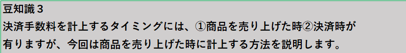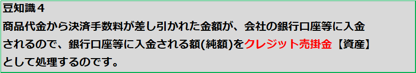 - 商品を売り上げた時に決済手数料を計上する場合、商品代金から決済手数料を差し引いた金額ををクレジット売掛金【資産】として処理します。